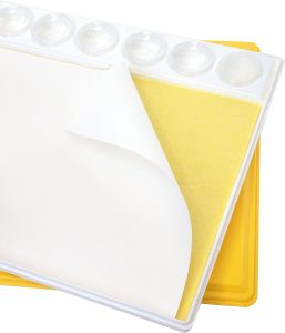 Ik heb een nieuw schilders palet gekocht, een Wet Palet, dit palet zorgt ervoor dat de verf niet uitdroogt, het is een box met een dun materiaal dat je nat moet maken, daarop komt een speciaal papier te liggen en daarop de verf.