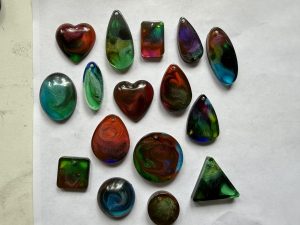 Zoals je op de foto ziet ben ik begonnen, je maakt eerst de mallen schoon, dan met speciale spray de mal in spuiten, bij een eerdere poging was het teveel spray en dat zag je terug in de epoxy.