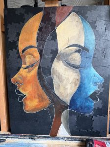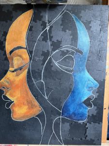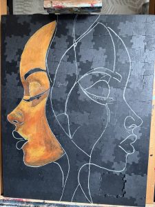 Ik heb de puzzelstukjes op een met zwarte Gesso ingesmeerde plaat geplakt, ik had ze eerst op een andere plaat gelegd en daarna, nadat ik ze zo strak en recht mogelijk had neergelegd, daarna met ducktape beplakt om de puzzelstukjes in een keer op de met lijm ingesmeerde plaat te schuiven.