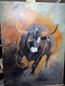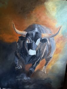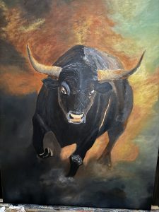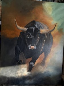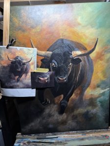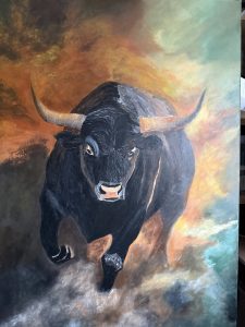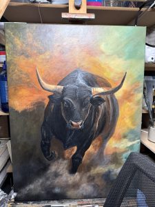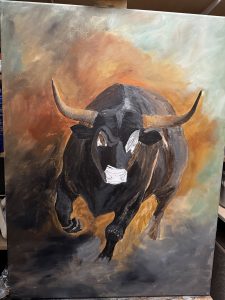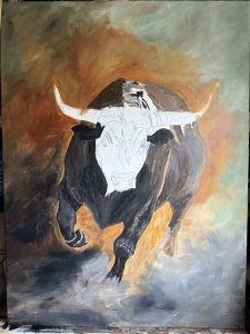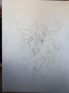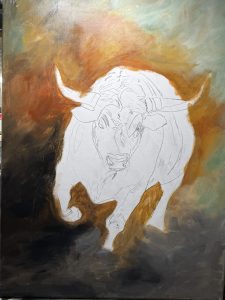 Ik wilde eerst een ram schilderen maar ik ben geswitcht het word een briesende stier puur omdat ik de actie die in het doek zit mooi vind.