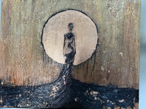 De onderlaag is nu wel zo’n beetje klaar, ik heb met een model pasta de jurk dikker opgezet, de jurk moeten boomwortels voorstellen en dat word hopelijk beter zichtbaar als ik met schilderen ga beginnen, de achtergrond heeft nu al een kleurtje maar er komt nog meer verf op!