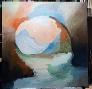 Vandaag weer verder gegaan met dit project (foto 4), en ik had wat moeite met het schilderen, als eerste omdat alle kleuren in elkaar moeten overlopen, en omdat het een groot doek is droogt de verf te snel, misschien omdat ik ook te droog schilder.