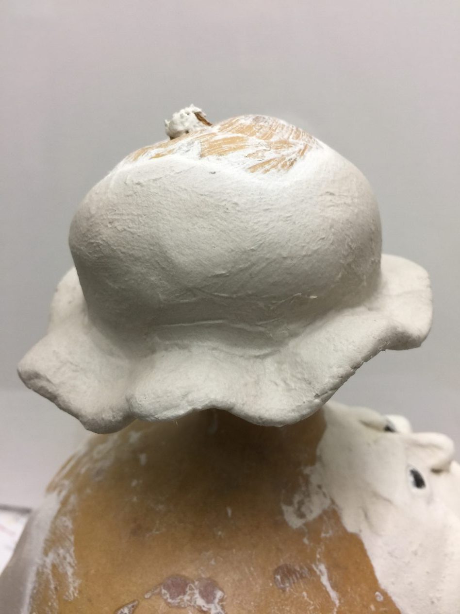 Het is de bedoeling dat het Kalabas Manneke een soort bolhoed krijgt maar dan toch een bolhoedje die bij het manneke past.